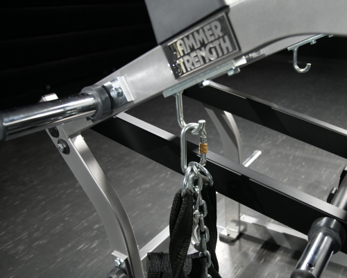 Multiple Anchoring Points Our Hammer Strength Belt Squat is equipped with four belt anchoring points, providing athletes with the flexibility to adjust the loading mechanics of their squat. | Band Pegs Users can increase their power development with our built-in band pegs. | Belt / Band Storage Optimize your facility's organization and efficiency with our built-in storage hooks. |